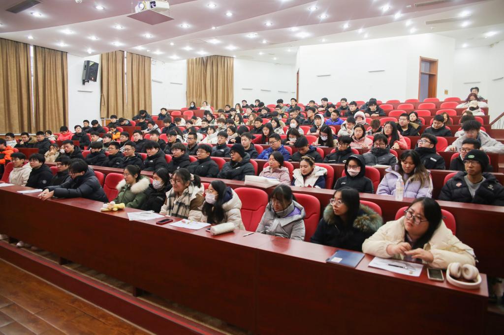 12月26日,pg游戏电子模拟器教师吕昊博士(后)和邵唐砂博士在西校园八角楼为2021级全体本科生作职业生涯规划经验分享,辅导员李炳树主持会议。