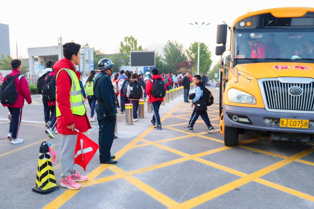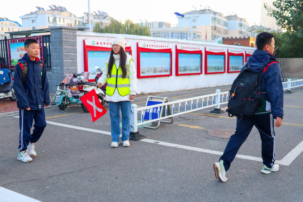 学生党员们身着统一服装,精神抖擞地伫立在路口,有条不紊地协助交警指挥交通,开展现场实操演练。他们用标准的手势引导车辆和行人有序通行,成为了粥店中学门口一道亮丽的风景线。