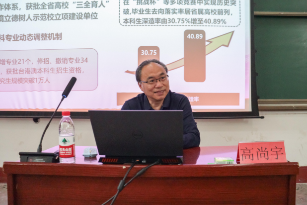 会上,高尚宇重点围绕学校第四次党代会基本情况、重要意义和主要成果、主要精神以及推动学校第四次党代会精神落实见效四个方面进行了全面阐释。他强调,学校第四次党代会系统擘画了学校高质量跨越式发展战略布局,明确了“一三六八十”的战略目标,全体师生要以战略思维谋全局,以改革精神破难题,以奋斗姿态抓落实,确保学院发展与学校战略同频共振。结合学校第四次党代会对新时代青年的要求,高尚宇向参会人员提出三点希望:一是要胸怀家国,志存高远,将个人理想融入国家发展大局。二是要勤学善思,锤炼本领,以扎实的专业知识支撑未来职业发展。三是要知行合一,勇于担当,在实践中增长才干,为学院和学校的高质量发展贡献青春力量。