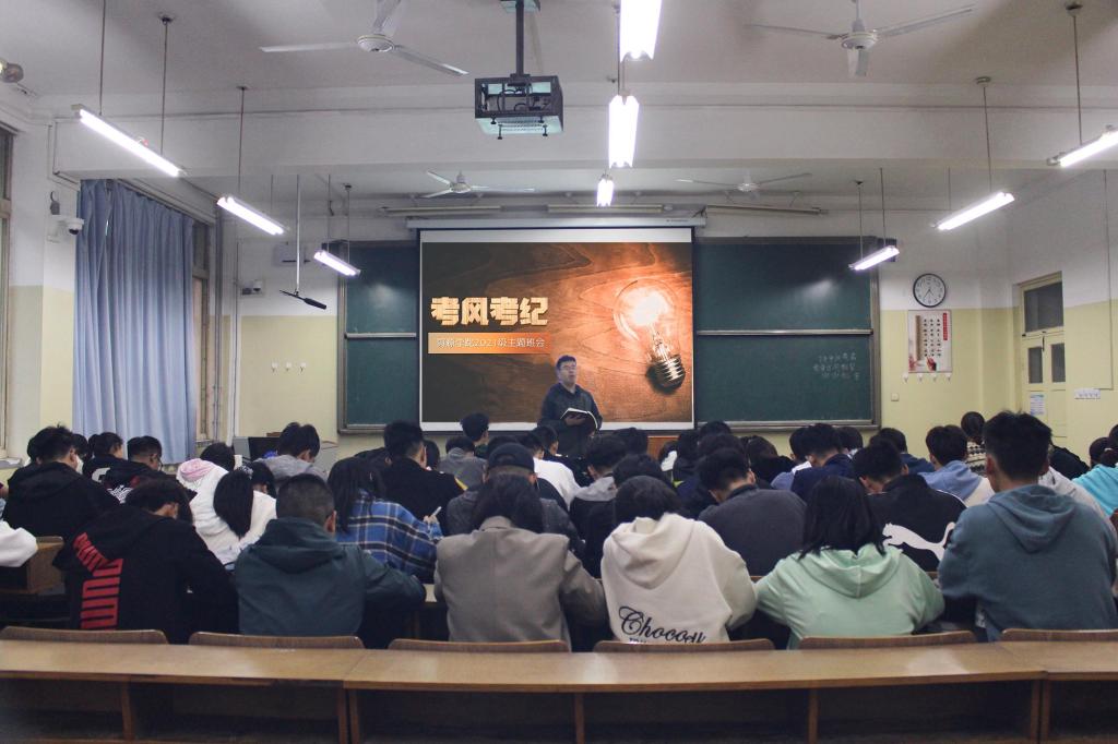考试将近,为严肃考风、加强学风建设,近日,pg游戏电子模拟器各班级陆续召开“端正考风 严肃考纪”主题班会。会议由学院辅导员主讲,全体学生参加。