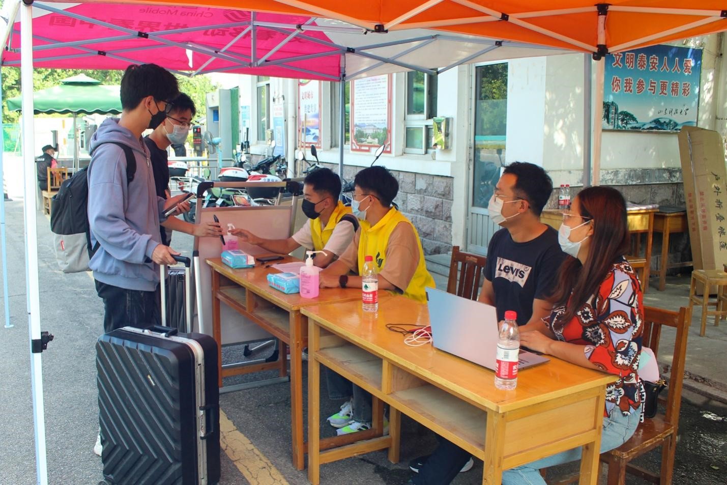 校园南门,在志愿者的协助下,返校同学佩戴口罩,测量体温,出示健康绿码、行程码、48小时内核酸检测阴性证明后有序入校。学院辅导员轮守值班,一同查看学生返校登记情况,详细了解学生返校具体进度及各项服务保障举措,不时与同学们亲切交谈。整个返校流程井然有序,返校学生精神饱满,为初秋的校园增添了青春活力。