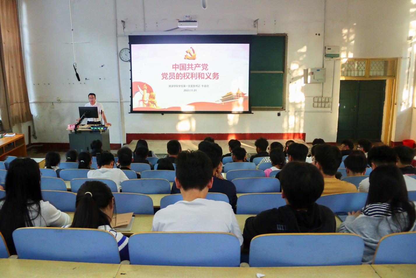 11月1日,pg游戏电子模拟器学生第一党支部书记、辅导员牛会功在1A107为入党积极分子讲授“中国共产党党员的权利和义务”专题党课。