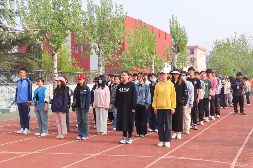 4月14日,学院学工办主任、团委书记洒艳及部分辅导员到操场指导运动会开幕式方队训练。