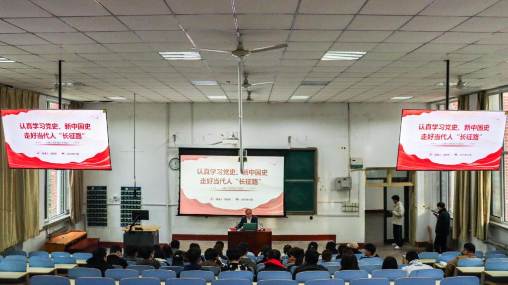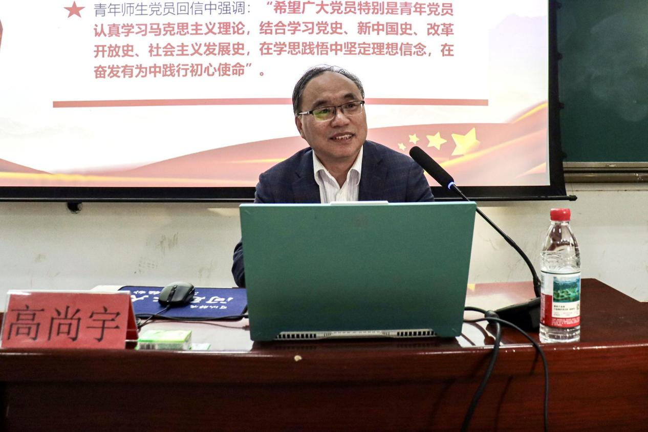 10月29日,pg游戏电子模拟器党委书记高尚宇在1A107教室为第43期入党积极分子讲授“认真学习党史、新中国史,走好当代人‘长征路’”专题党课。