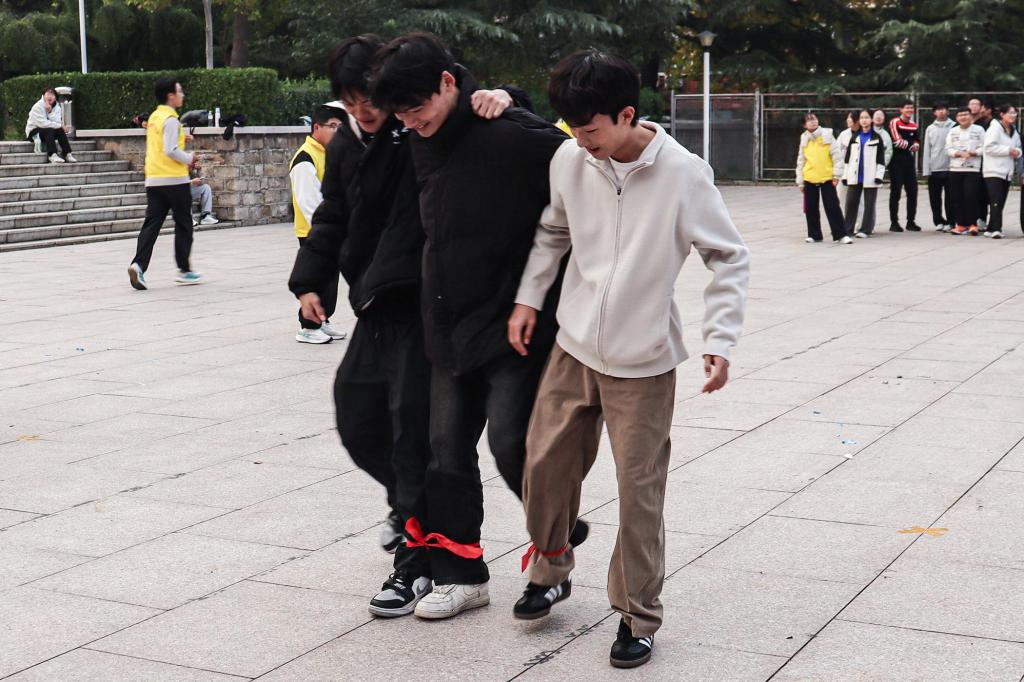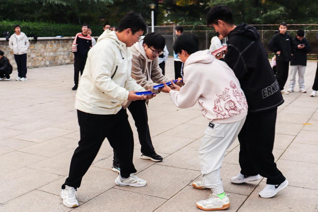 比赛过程中,各宿舍参赛选手全情投入、默契配合。“托球进杯”环节里,队员们手持弧形板,灵活调整站位与力度,确保乒乓球平稳传递;“绑腿跑”环节则将现场气氛推向高潮——相邻队员的腿被红绳紧密绑定,大家肩并肩同步迈步,齐声喊着“一二一”的口号保持节奏,即便偶尔出现趔趄,也会立刻互相搀扶调整,充分展现出宿舍集体的凝聚力与协作力。整场比赛期间,现场掌声、欢笑声不断,氛围热烈融洽。