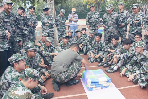 叠军被是军训的必修课,也是军训文化的一道风景。现场,教官给同学们示范了叠军被的具体步骤,并重点强调了展、压、折、叠、整、捏边、抠角、整平等重难点动作。随后,同学们谨记要领,严格按照步骤动手实践,他们动作标准、手法娴熟,用一个个整齐的“豆腐块”为今天的练习交上了一份满意的答卷。