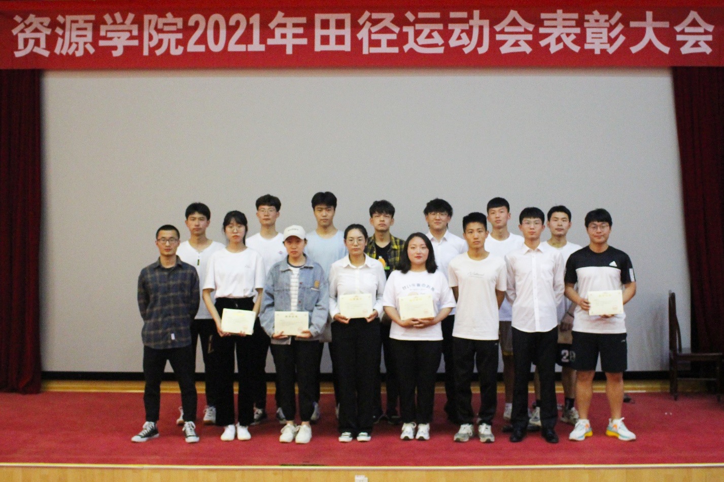 5月25日,pg游戏电子模拟器在四号楼报告厅召开2021年田径运动会表彰大会。学院党委副书记兼副院长程家国、团委书记洒艳、学院辅导员张运忠、卢业美、学生会负责人姜自健出席大会。会议由学院辅导员王淦主持,学院运动员代表与学生代表参会。