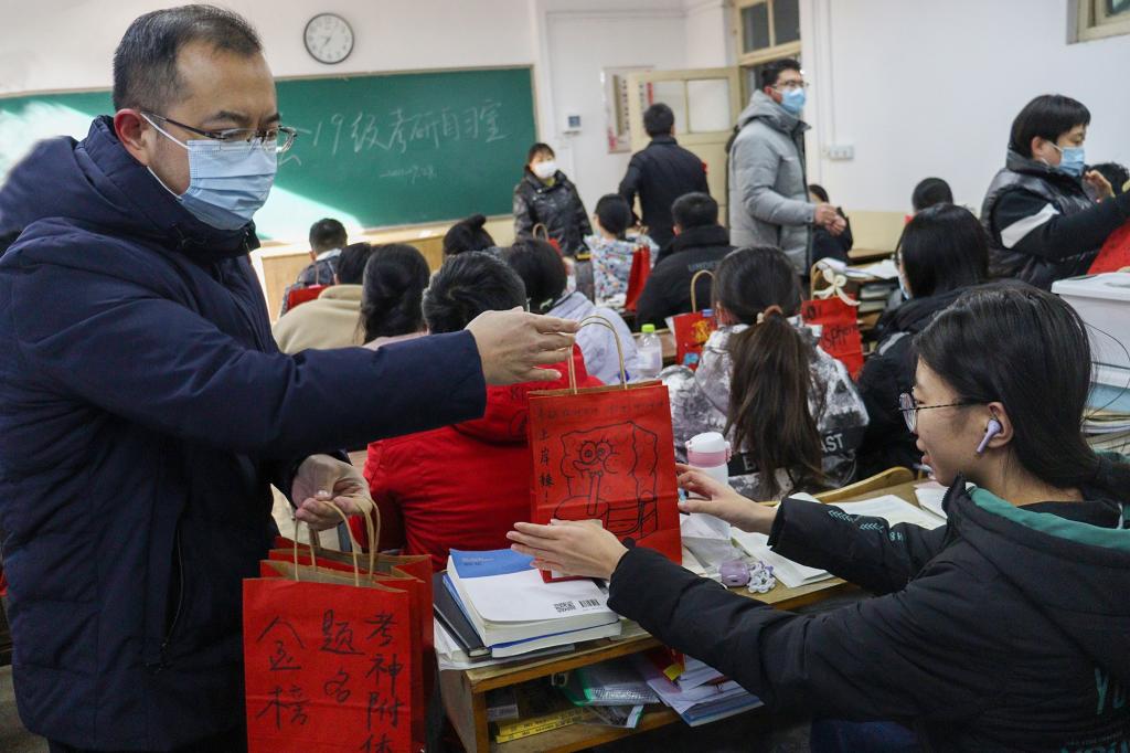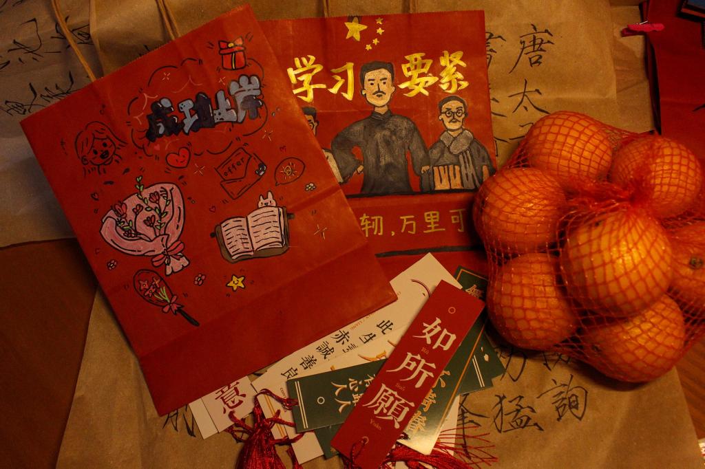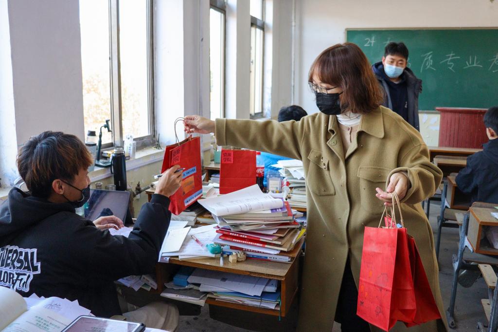 文具套装助力下笔有神;橙子象征着一举“橙”名;苹果寓意“‘苹’安上岸”;糖果送去幸福甜蜜;口罩和暖宝宝温暖关怀着学子们的身体健康;祝福卡片承载师生的殷殷心意……300个考研福袋里的暖心“六件套”,每一件礼物都蕴含着美好的寓意。
