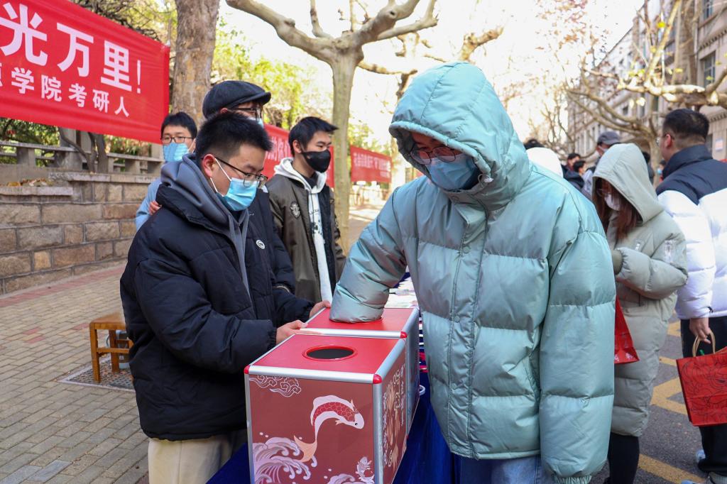 “没有横空出世的幸运,只有不为人知的努力。看着学长学姐们在心无旁骛地为自己的目标院校而拼搏奋斗,我深受感动。设计这个福袋,也希望学长学姐能够锦鲤附体,一战成硕!”当谈到为身边考研同学送祝福的初衷时,学生会主席团成员王一说道。