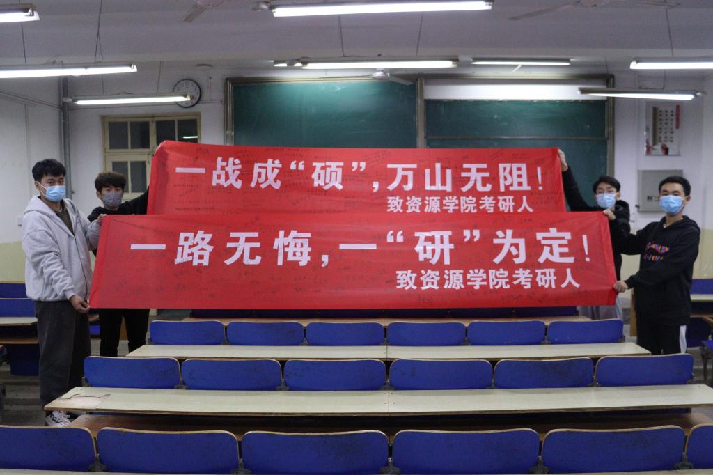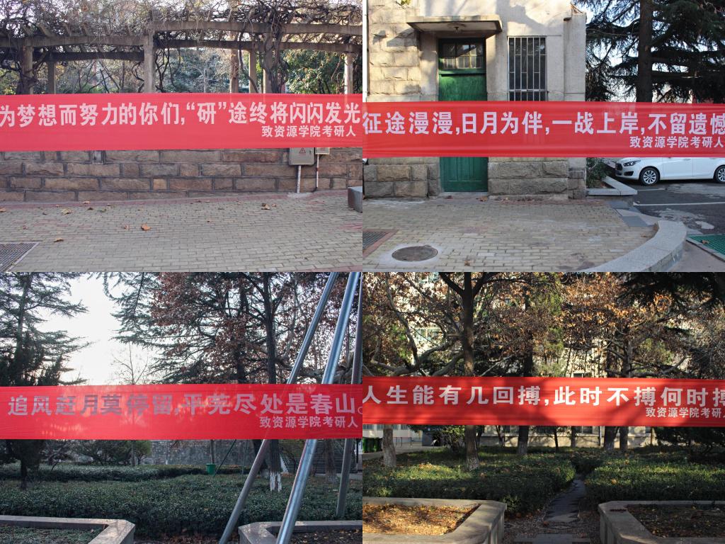 “追风赶月莫停留,平芜尽处是春山。”“人生能有几回搏,此时不搏何时搏!”“为梦想而努力的你们,“研”途终将闪闪发光!”字句交相连缀,祝福汇流成河,条条条幅化作道道暖流,将温暖输送进每位考研学子的心田。