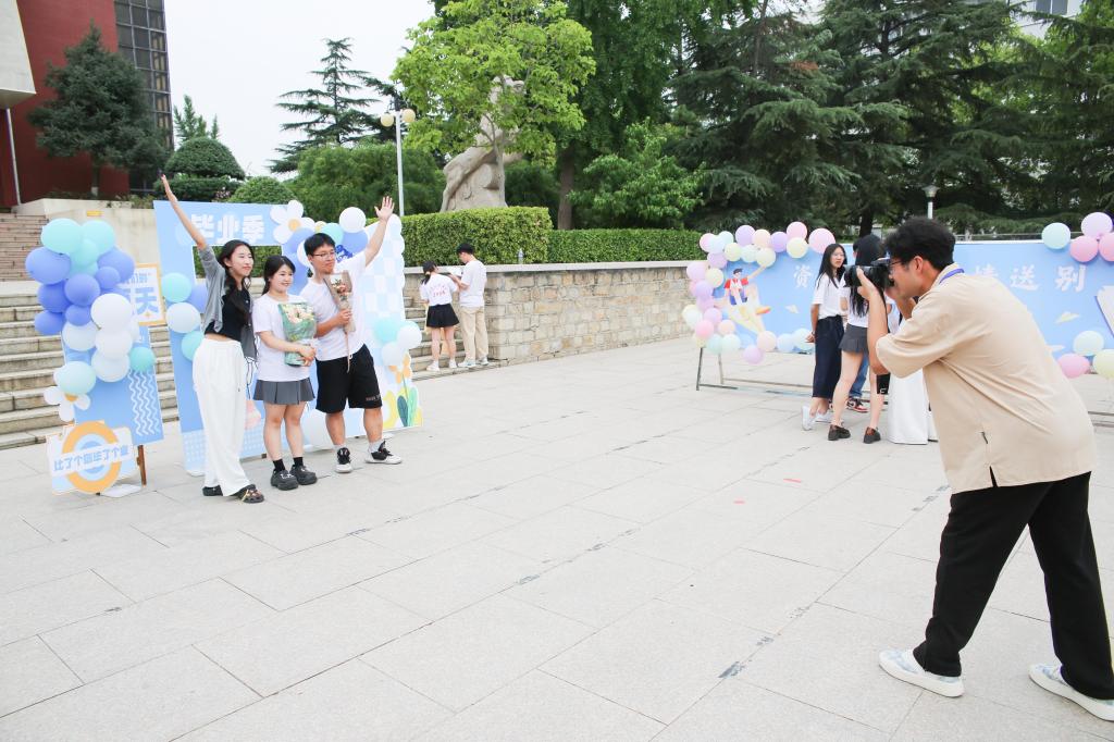 青春凝聚成回忆,美好定格为永恒。展板上挂着的蓝白气球轻盈飘舞,背景板上绚丽的花朵竞相绽放,镌刻着“我们毕业了”的标语格外醒目。毕业生纷纷驻足毕业季照片墙,与同窗、与恩师,留下一张张珍贵的合影,将这份青春美好定格在永远。毕业只是人生旅程中的一个里程碑,透过照片,展望未来,激励着毕业生不断前行,再创人生辉煌。