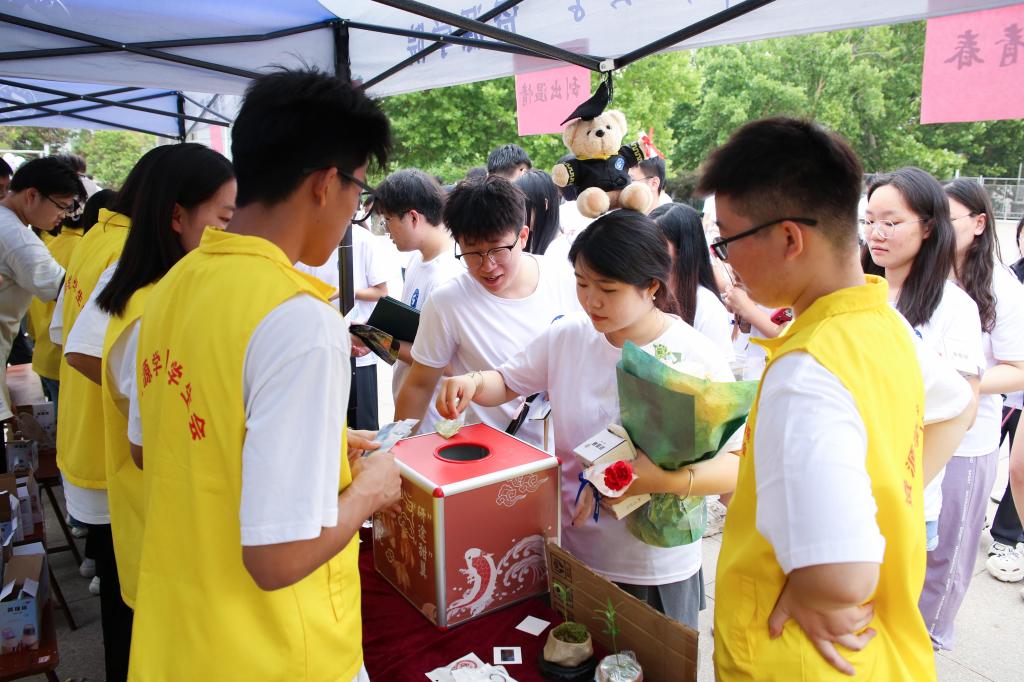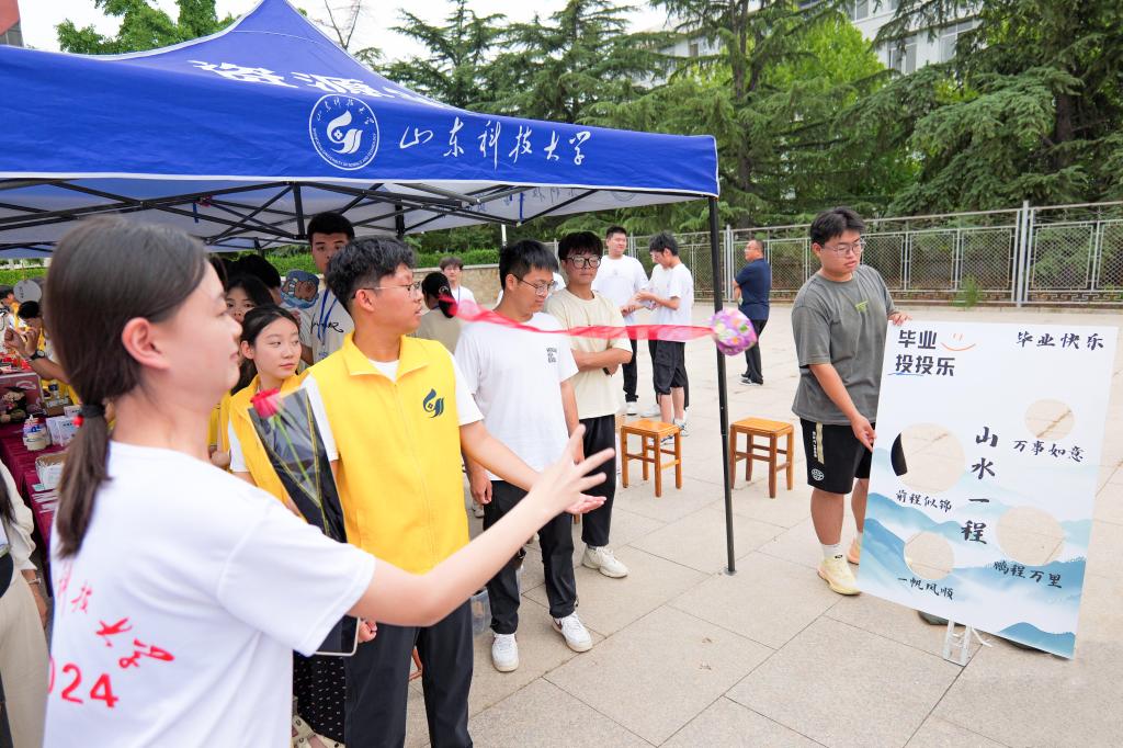 瞄准、出手、命中……毕业生投掷出的沙包准确通过洞口,现场不断响起阵阵欢呼声。根据投中次数,还可以兑换不同的奖品,从有趣的玩偶公仔,到富有创意的植物盆栽,精心准备的毕业惊喜寄托着学院美好祝愿,打动着每一位毕业生的心。