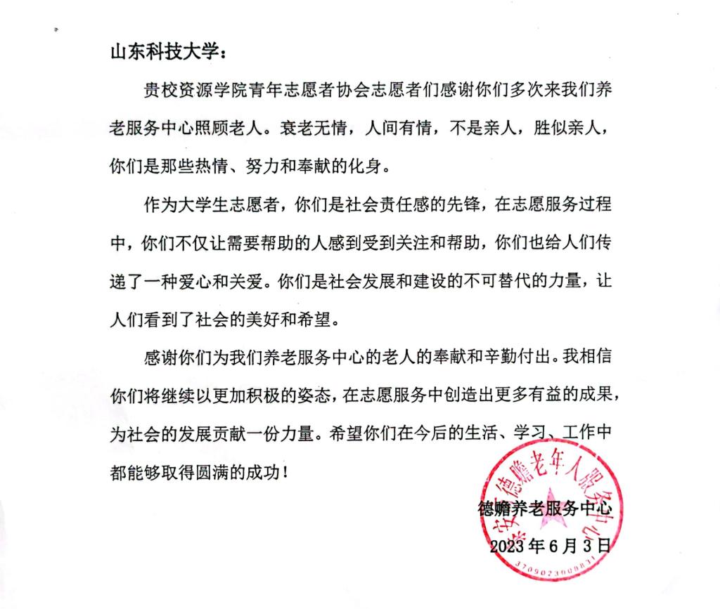 活动后,pg游戏电子模拟器收到德赡养老服务中心感谢信。志愿者们深受鼓舞,纷纷表示将进一步弘扬志愿服务精神,持续开展好校内外志愿服务活动,丰富活动载体,创新活动形式,让“奉献、友爱、互助、进步”的志愿服务精神在学院蔚然成风。(pg游戏电子模拟器供稿)