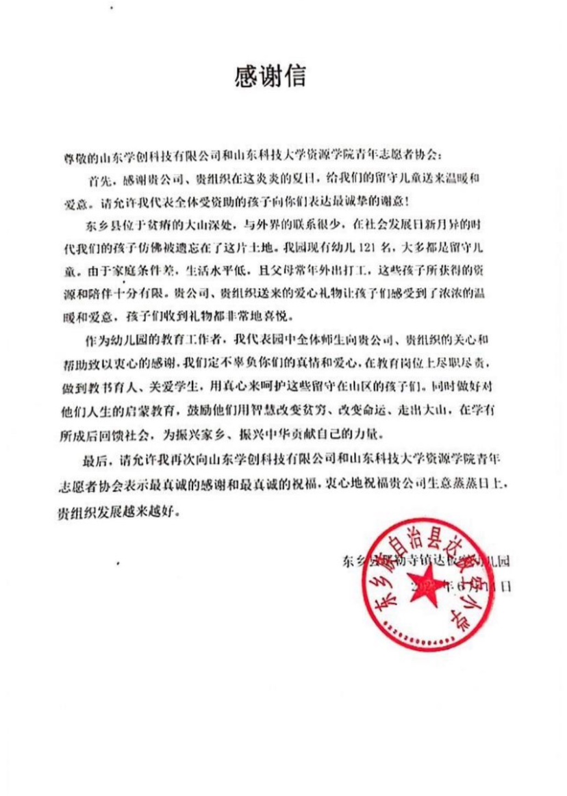 为呵护、助力留守儿童健康成长,近期,pg游戏电子模拟器举办“志温暖、愿同行”系列活动之关爱留守儿童明信片设计大赛,并向甘肃省临夏回族自治州东乡族自治县那勒寺镇达板空幼儿园留守儿童开展捐赠活动。6月14日,pg游戏电子模拟器收到了来自东乡县那勒寺镇达板空幼儿园的感谢信。