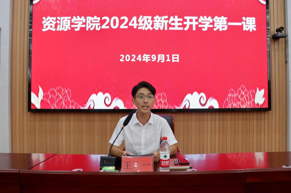 王一首先向2024级新生致以热烈的欢迎和诚挚的祝贺,介绍了学院的发展历程、专业设置和大学生科技创新、文体活动等基本情况。王一还围绕校园安全、校规校纪、学风建设、日常管理四个方面进行了全面讲解,让新生们对学院有了更加清晰的认识。针对怎样才能过好充实而有意义的大学生活,王一对2024级新生提出了三点建议:一是要奋发图强,学无止境。保持学习的热情,勇于探索未知领域,拓宽知识视野。二是要勇于实践,全面发展。积极投身各类实践活动,练就过硬本领,提升综合素质。三是要培养健康心态,锤炼品德修为。以积极理性的态度面对生活中的困难与挫折,树立正确的价值观和人生观。