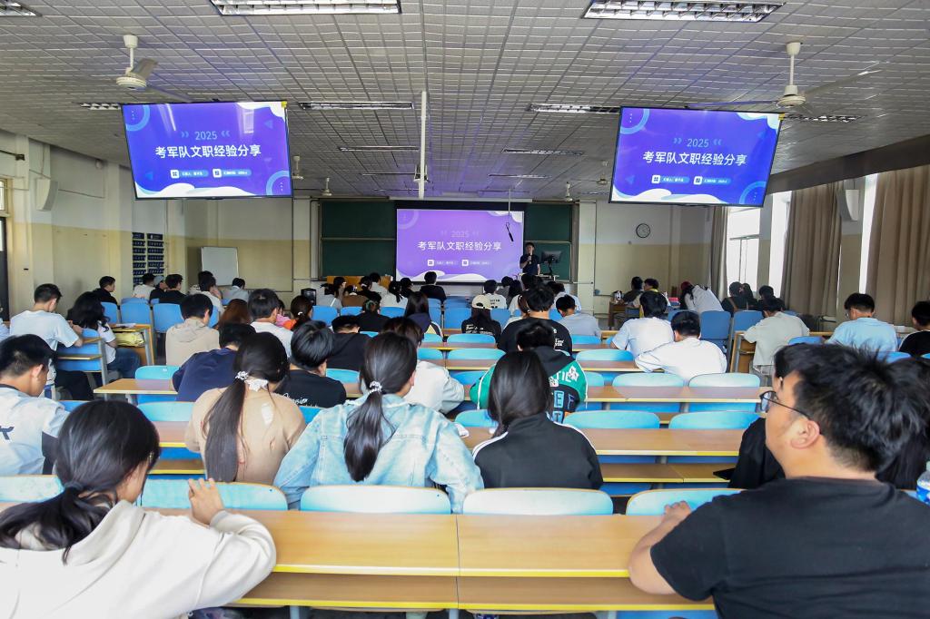 会上,两位主讲人从自身经验出发,结合身边典型案例,分别从考录公务员与军队文职两方面分享经验。在公务员考录方面,毕林林从选岗、备考、心态三方面展开详细分享。选岗时,建议同学们综合考量工作地点、专业对口情况及自身优劣势,慎重选择报考岗位;备考要合理规划并掌握方法;同时注意调整备考心态。军队文职考录方面,曹子玉详细介绍了军队文职概念、岗位类型、薪资待遇等内容,并给出备考建议,推荐备考资料,还分享了应对考试焦虑与压力的实用技巧,助力同学们从容应考。